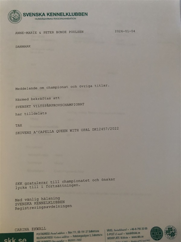 I 2024 har Luna således færdiggjort sit Danske Championat, kun 25 mdr. gammel samt minsandten også sit Svenske Championat idet Luna fik 2 x cert på udstillinger i Tvååker i Sverige, hvor Luna blev vinder af jagtklassen begge dage i god konkurrence og efterfølgende 2. bedste tæve til tæven fra Champion klassen.